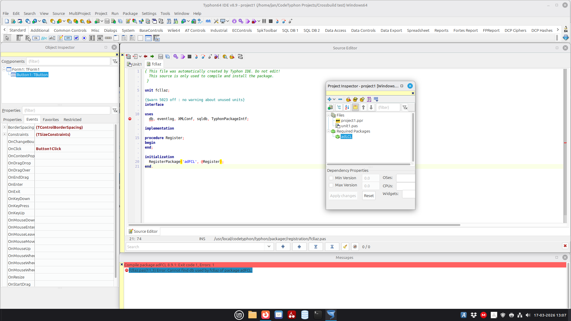 Now I try to build this simple project as a Windows 64 application, but I keep getting an error in fcllaz that db cannot be found (see screenshot).